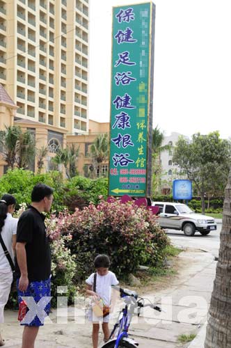 在游客眾多的三亞著名景區(qū)三亞灣附近,“根浴”廣告牌豎立在街頭。