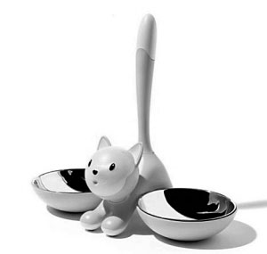 一只準備開跑的小貓身邊放著兩個盤子。從貓的表情到直豎的尾巴再到流線設(shè)計的食盆,做工都相當精致,只有家有愛寵的人才能如此貼心地專門為貓咪打造這樣一個食盆。