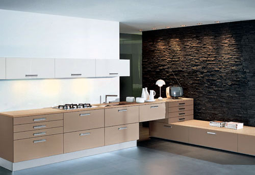 煙機(jī)不過是最常見的廚房道具,但在這里,復(fù)式的房子,為長型的煙機(jī)提供了展現(xiàn)自我的場地,不僅能把功能發(fā)揮到極致,更能成為最引人注目的裝飾品。如果你有足夠的創(chuàng)意,不妨還可以像這樣把大型魚缸搬到廚房來,讓他們營造出更前衛(wèi)的效果。