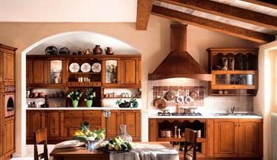 鄉(xiāng)村風(fēng)格的廚房櫥柜多以實(shí)木為主,因?yàn)樗咏匀坏沫h(huán)境,材質(zhì)以松木、橡木等最為精典,這種風(fēng)格的代表以歐式廚房及美式廚房為主,歐式鄉(xiāng)村風(fēng)格在外表上更細(xì)膩,色彩較為豐富;美式則更為純樸,寬大的中心島代表了主人對(duì)廚房生活的重視。