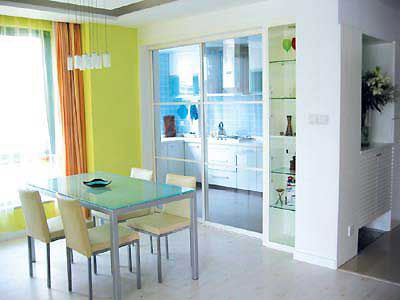 當然,一出廚房就是餐廳空間更好,因為動線最短。從衛(wèi)生的角度考慮,如果廚房與餐廳距離太遠,或者是要穿過一些房間,在走路的過程中,很容易就將菜品的湯汁灑落在地板上,這樣會使房間不潔凈,而且還要耗費很多精力去清洗地板。習慣中餐者或因廚房空間夠大,或因為其他空間不夠,便將飯桌擺在廚房內(nèi),這非理想之局。因為煮菜時油煙及熱氣較大,影響用餐衛(wèi)生和進餐者的好心情。如果是飯桌擺在廚房內(nèi)的格局,用餐前最好將廚房內(nèi)的熱氣用抽油煙機抽除,以保持空氣流通。