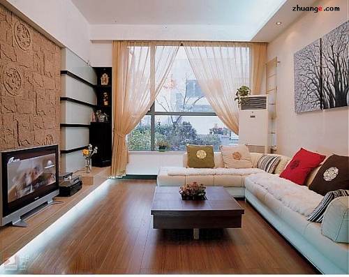 以往人們家的電視墻一般與其他墻面一樣,而現(xiàn)在往往選擇電視墻與客廳其他墻面不一樣。對電視墻進(jìn)行單獨(dú)的設(shè)計(jì)與裝修,如采用紋理粗糙的文化石鑲嵌。從功能上說,文化石可以吸音,避免音響對其他居室的影響,從裝飾效果上看,它烘托出電器產(chǎn)品金屬的精致感,形成一種強(qiáng)烈的質(zhì)感對比,十分富有現(xiàn)代感。旁邊設(shè)置兩個(gè)櫥架擺放著主人心愛的藝術(shù)品,點(diǎn)綴其間,體現(xiàn)主人的高雅氣質(zhì)。