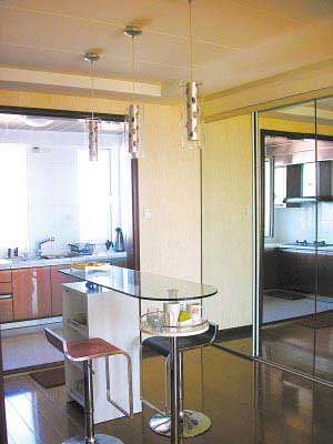 不過,廚房吧臺與客廳、臥室里的吧臺有很大的不同??蛷d和臥室是居室的重點區(qū)域,一般都裝飾得非常講究。這里的吧臺更講究和環(huán)境相適應(yīng),造型應(yīng)簡潔明快,具有一定裝飾性,富于生氣,需要盡量避免呆板生硬的設(shè)計。
