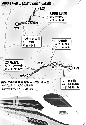 4月1日,全國(guó)鐵路開(kāi)始實(shí)行新的列車(chē)運(yùn)行圖,屆時(shí)全國(guó)新開(kāi)行動(dòng)車(chē)組41對(duì),整體運(yùn)能提高10.6%。鐵道部將時(shí)速250公里合武客專(zhuān)、石太客專(zhuān)的開(kāi)行,視為此次調(diào)圖最大的亮點(diǎn)。