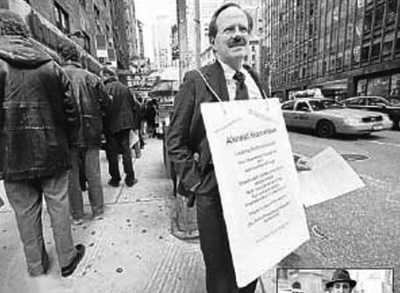 為了盡快找一份工作養(yǎng)家糊口,保羅在脖子上掛上一塊推銷自己的牌子,走上紐約市人流如織的街道向路人不斷發(fā)送履歷。每天,保羅都身穿筆挺西裝,站在繁忙路口“推銷自己”,而他胸口掛著的牌子上寫著:“幾乎無家可歸,急盼獲雇傭。經(jīng)驗(yàn)豐富的業(yè)務(wù)和行政部門管理人員,絕望地尋求一份帶就業(yè)保險(xiǎn)的全職工作。家中殘疾妻子15年來一直在接受藥物治療。請(qǐng)索取本人簡(jiǎn)歷,任何幫助都將感激不盡?!?/P>