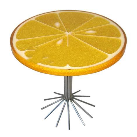 這個桌子是一片非常巨大的橙子,它不是印上去的,而是用樹脂非常形象的將它制作出來,看看里面的肉、籽、還有外面的皮,看了就能讓你感覺維C 撲面而來。