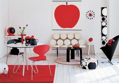 從小到大,吃得最多的水果好像就是蘋果。記得小時(shí)候第一次上繪畫課畫的也是蘋果。蘋果就是這樣招人喜愛并充滿誘惑力,用它的大幅圖片做裝飾,整個(gè)房間都顯得明朗活潑起來。當(dāng)然,讓你心情變好的不僅是蘋果圖畫,還有那些像波浪又像水滴的曲線和圖案。另外,黑白紅的安全色彩搭配和各種圓形造型組合也讓居室活潑而不繁雜。