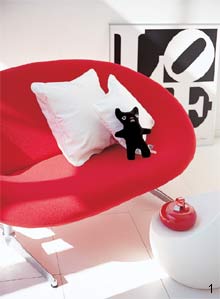 草莓色的沙發(fā)配以銀灰色的不銹鋼腳架,非?,F(xiàn)代。小熊玩具和白色靠墊以及造型奇特的茶幾增添了一些活潑的色彩。不過這么跳的顏色不適于大面積使用,作為居室的點(diǎn)綴還是很有情調(diào)的。