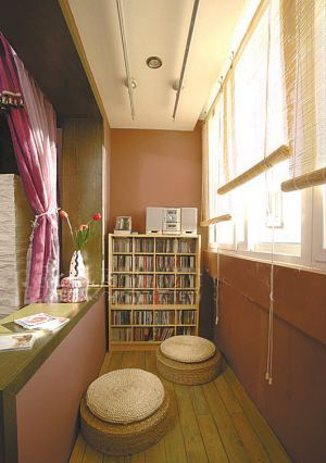 如果把陽臺與居室打通,陽臺就可以成為嶄新的書房而加以利用了。在靠墻的位置裝上層層固定式書架,再放上一張小巧的書桌,用心愛的窗簾阻隔室外的喧器;入夜,還可以伴著柔和的臺燈,誦讀自己鐘情的書籍