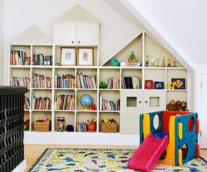 收納架不是正方形或長方形,換個(gè)角度我們就可以創(chuàng)造出一些新奇的收納方式。在斜屋頂下正好適合這些三角形開放式收納架,在兩個(gè)有門的收納柜中可以放一些不讓孩子觸及的物品。