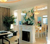 本案客廳的色彩運(yùn)用了明黃色,并配以白色的頂角和踢角。而地中海式風(fēng)格的壁爐處于主角位置。百安居裝潢中心的設(shè)計(jì)師徐冬萍稱,原先想把壁爐和電視柜結(jié)合在一起。并為此設(shè)計(jì)了多種樣式,但總覺得古典的壁爐和現(xiàn)代的電器融合在一起不是很合適。最后,才把電視柜單拿一邊。這樣帶有巴洛克樣式的白色大理石壁爐成為最終選擇。但是4.2米挑高的客廳光放一個(gè)壁爐是很顯單薄的,于是,把壁爐后的整面墻做突出,并在上面用了塊極漂亮又有吉祥意義的孔雀圖案與壁爐一起相互輝映。然后考慮的體量關(guān)系,兩邊再點(diǎn)綴上銅制的壁燈。