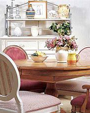 由于不少家庭出于戶型的考慮,并未特地開辟家居餐廳,但卻可以稍費心思在客廳的某個位置標新立異,于是一個特殊的就餐環(huán)境便能在客廳的范圍內(nèi)“渾然天成”。白色櫥柜因為鐵藝擱架的設(shè)計變得有些與眾不同,上面可以擺放些物品,集收納、展示于一體。而原木色餐桌與方格布藝餐椅椅墊相互搭配,形成悠閑清爽的地中海風格。就餐的心情便像地中海的微風迎面吹來般享受愜意。