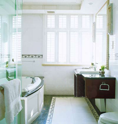 在這間浴室里,陽光充滿每一個角落,這本身就是一件讓人與自然最親近的方式,所以干脆摒棄一切華麗的色彩和繁復(fù)的線條,完全用很純潔的白色和簡練的黑來裝飾整個空間,不拖泥帶水。