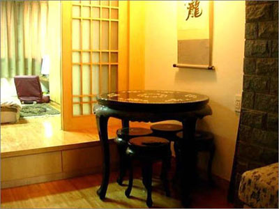 青磚處原本是客臥的間隔墻。敲掉后將臥室向里移了1米多,抬高做了地臺(tái)。梁不能敲,干脆帖上青磚,算客廳和餐廳的隔籪斷。