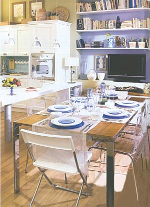在這35平方米空間里可說是五臟俱全。一張餐桌、六把餐椅,占據(jù)了客廳的所有活動空間,但有了可伸縮的餐桌,在不聚餐的時候,客廳里的活動空間可被完整地還原。金屬結(jié)構、橡木臺面的餐桌搭配半透明水晶外殼的椅子,布置出簡潔的就餐領地。準備若干把可折疊的椅子是必要,方便就餐客人人數(shù)的增減。白色的桌布、藍白兩色的餐具干凈清爽??臻g雖小,與朋友相聚的快樂卻一點都不會減少。