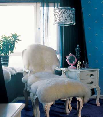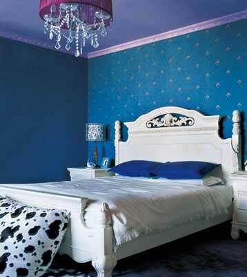 臥室吉米特別強(qiáng)調(diào)了色彩在功能性上所起的作用,因?yàn)榕P室如果用紅和綠會(huì)比較亢奮,不能馬上進(jìn)入睡眠狀態(tài)。于是,吉米選擇了深色,吊燈有點(diǎn)發(fā)紫,地毯也是紫藍(lán)的顏色,窗簾又是黑色。到家累了,一拉窗簾,完全就是休息的氛圍。但是床上用品和家具,吉米選擇了白色,這樣就不會(huì)那么悶。