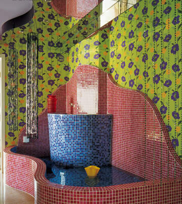 吉米的家有三個(gè)特點(diǎn):一是色彩豐富,用色彩極其大膽;二是鏡子多,大到餐廳整面墻,小到臥室的小圓鏡,吉米想照就照,十分方便;三是珠簾分布廣。
