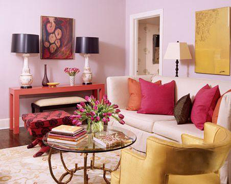 粉紅色給人以溫暖、放松的感覺,適宜在客廳和臥室里使用。如果地板用柔和的粉紅色,可以選擇用同色的布藝靠墊以及有粉紅色印花的窗簾。在白色的沙發(fā)、米黃色墻的襯托下,再加點(diǎn)兒淡藍(lán)色,就會形成花壇般的羅曼蒂克格調(diào),頗適合年輕人的品位。