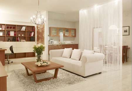 用珠簾來分隔空間,既能夠保持空間的通透性,不影響采光,又能為房間增添浪漫氣氛。圖1案例中,珠簾將客廳區(qū)域和餐廳區(qū)域進(jìn)行了分隔,讓兩個(gè)功能區(qū)相對(duì)獨(dú)立,但又并非完全被割裂開來。大面積白色的運(yùn)用也很好地呼應(yīng)了整個(gè)房間的淺色調(diào)主題,顯得干凈、簡(jiǎn)潔。