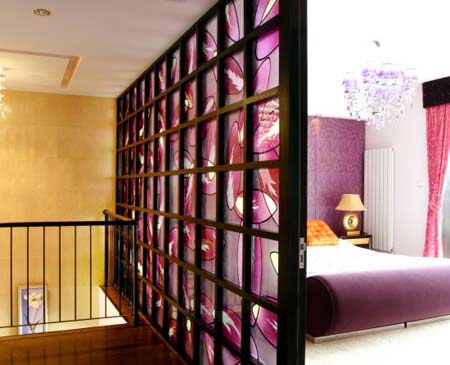 案例中,樓梯間與臥室相鄰,因?yàn)闃翘蓍g沒有窗戶,因此采光受到了很大影響。將原有的臥室墻面改造成一面玻璃隔斷,這個(gè)問題便迎刃而解了。紫色花紋的玻璃隔斷不僅與臥室主色調(diào)相一致,并且將臥室窗外的光線“引進(jìn)”到了樓梯間,讓此處的采光效果得到了極大改善。