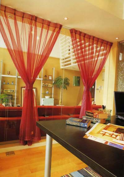 想要在客廳里分割出書房空間,使用玻璃墻是最好的辦法。玻璃墻不僅有良好的隔音效果,保證了書房空間的安靜,它還最大限度地保障了書房空間的采光效果不受影響。如果想要為書房增添一些私秘感,則可以在玻璃墻外懸掛一幅半透明的紗簾,它既實(shí)用,又能為居室增添美感。