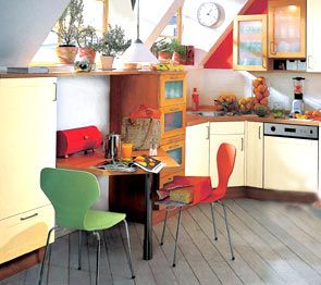 通常斜屋頂?shù)姆孔涌臻g極其不規(guī)則,櫥柜的拐角處利用率不是很高,不過通過合理的設計可以賦予空間以實際的功用,天窗的兩側安置了兩個櫥柜后,設計師巧妙地在櫥柜間安置了一個擱板,這樣空間的上部被利用了起來,但是擱板下面呢?空著太可惜,放點什么呢?設計師利用空間的層次,將天窗下的空間變廢為寶,一張簡單的小桌,一兩把簡單的椅子,陽光透過天窗射進來,不規(guī)則的空間也能收納有致。