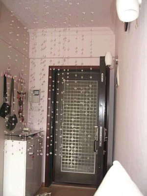 這是進(jìn)門的玄關(guān),風(fēng)水上說一定要有的.還要有個(gè)木鞋架.因?yàn)槲覀兊膽粜痛箝T對(duì)著陽(yáng)臺(tái),是屬于散財(cái)?shù)母窬?所以加了珠簾擋住:)嘿嘿