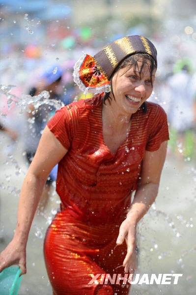 4月15日,一位外國游客也穿上傣族服裝,沐浴在吉祥之水中。新華社記者秦晴攝