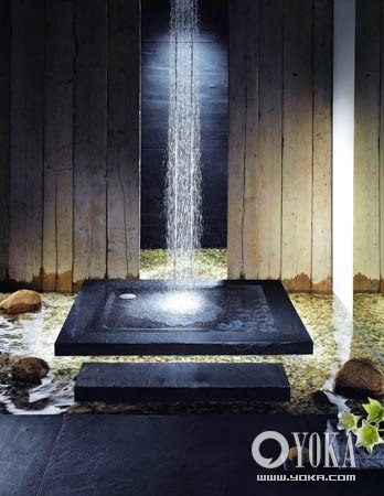 突破常規(guī)的浴室設(shè)計(jì),取消了淋浴房常見的玻璃圍合,在浴室地面鋪上鵝卵石,幾塊大石隨意安置在鵝卵石上,浴室墻面則以本色防腐木為飾。沐浴之時,水流自上而下,仿若流瀑,而黑色裝飾百合花圖案的超平地面式鋼瓷釉淋浴盆,則保證了沐浴時腳部的舒適感。