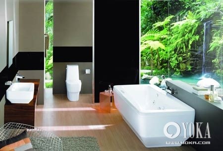 把浴室搬進(jìn)山林聽起來有些瘋狂,但把“山林野樹”遷入浴室,卻并非完全不可行??吭「椎膲φ尜N上數(shù)碼噴繪的自然風(fēng)景圖片,不出浴室就能體驗(yàn)到自然之趣?,F(xiàn)在有些墻紙專賣店能提供此類的定制圖案壁紙服務(wù)