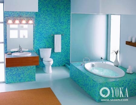浴室局部墻面和浴缸基座都用深淺不一的藍(lán)色馬賽克貼面,營造出海洋般清新開朗的氣質(zhì),配合白色的浴室地面,更能起到給視覺降溫的效果。