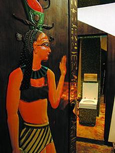 這個衛(wèi)生間點睛之處在于門,手繪的埃及傳統(tǒng)人像,做出了浮雕的效果,花邊是埃及的壁畫上的象形文字,厚重的大門配以手感很好的金色把手,讓人在推開之前對里面的情形充滿了想像。