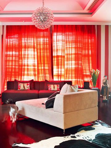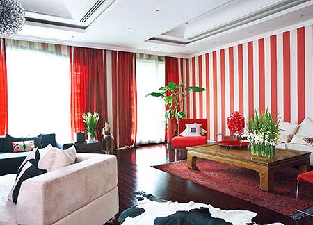 紅色是客廳的基調(diào),條紋圖案的墻面是女主人的別致創(chuàng)意?! ?/P>