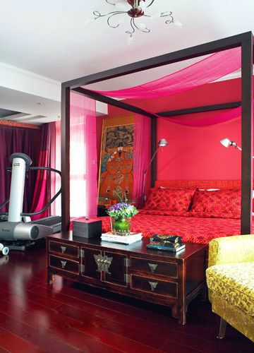 紅色也是臥室的主色調(diào),紫色的布瞞更加強(qiáng)了空間的嫵媚。