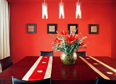 餐廳的紅色墻面是客廳的延續(xù),空間感覺活潑、熱烈。