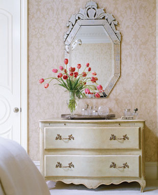 為了讓臥室增添柔美氣質(zhì),你還可以通過使用簡單而素雅的淡綠色和奶油色,巧妙地將臥室?guī)胍粋€寧靜的空間。而英式的花緞壁紙則顯得平和而親切,這是涂料粉刷所達(dá)不到的效果。在家具的選擇上,你可以不必用家具和配飾來填充空間,選擇幾件體形不大的家具,通過獨(dú)立擺放就會讓臥室顯得精致而優(yōu)雅。