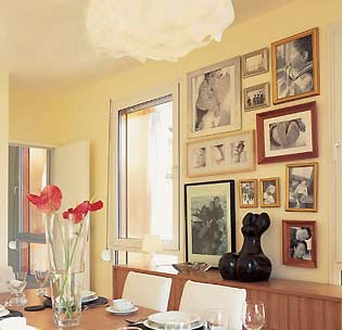 每一張照片都有一個故事。周末的時候,一家人圍坐在餐桌旁,邊吃飯邊話說當(dāng)年,合著窗外暖暖的陽光,其樂融融。幾乎貼滿墻壁的照片,沒有什么規(guī)則地排列著,花瓶、餐具、桌椅等物品雖然很多,看似復(fù)雜,卻在顏色與形式上統(tǒng)一成對美好歲月的回憶和感謝。