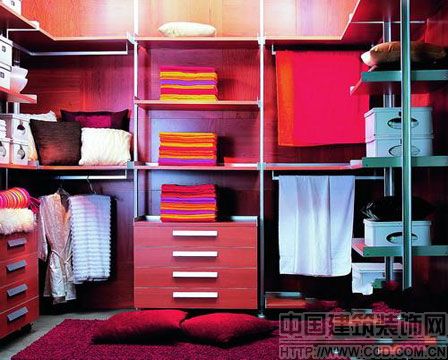 由不同規(guī)格的木板與連接五金件拼裝而成,比木榫連接更牢固。旋轉(zhuǎn)衣架、下拉式掛桿、各種功能性拉籃在此大顯身手,所有服飾都能在其中找到自己合適的“家”。