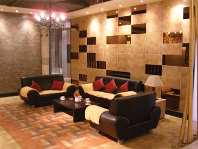 客廳的輪廓以斜插竹桿、磚體屏風劃分,豪華的歐式吊燈與熱情洋溢的“威尼斯春天”系列地磚上下呼應,真皮沙發(fā)套裝,硬木茶幾,墻面是由墻壁上凹凸混鋪的瓷磚和茶色的反光鏡片巧妙的穿插。整個客廳活潑而不炫亂,更顯現(xiàn)代風尚,無論新朋舊友皆可由衷感受到主人的熱情好客與雍容大方。