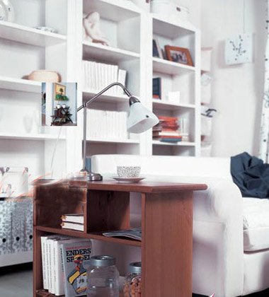 當(dāng)?shù)孛嫔弦呀?jīng)沒有多余空間的時候,我們可以開始打墻面的主意了,沙發(fā)后面的墻壁可以好 好的利用起來。放置豎款CD架,既可以大量地收納CD,也可以作為一種漂亮的展示,同時還可以利用沙發(fā)扶手旁邊的空白墻壁,在這個較低的位置上掛置一個報刊架,沙發(fā)前的茶幾下也有空位,放置一個儲物箱,方便又實用。