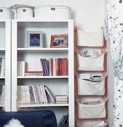 一般我們的家具都是規(guī)則的方形,并且我們習(xí)慣把家具貼墻放置,這樣在家具側(cè)面和墻之間就有一個三角形的空閑地帶,可以放置一排儲物袋,收納報刊雜志和零碎物品