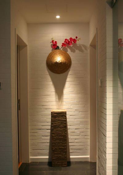 通常,門廳墻面色調(diào)與造型是最先闖進(jìn)人的視線的東西,也是最能給人產(chǎn)生心理聯(lián)想的地方。所以,在考慮門廳墻面的設(shè)計(jì)時(shí)候,因?yàn)殚T廳一般都不太大,一定要注意其單純與明確的風(fēng)格定位,不要把復(fù)雜的設(shè)計(jì)帶進(jìn)門廳墻面。如果是別墅之類的大房子的大門廳,當(dāng)然可以不受此限制。