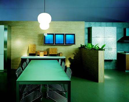 輕松舒爽、賞心悅目的色彩。綠色是永遠(yuǎn)用不完,永遠(yuǎn)不會讓人感到厭煩的主題,因為它的每一點變化,都對應(yīng)著自然給人類的印象,所以綠色適合所有喜歡它的人。從淡綠轉(zhuǎn)化為灰綠,然后暗紫,完成室外到室內(nèi)的過渡,對應(yīng)了人的視覺對空間的自然反應(yīng)。淡綠如田野的地板,黃色如秋葉的柜體,墨綠如松針的臺面,構(gòu)成一幅自然景色,使人心情豁然開朗。淡綠與淡藍(lán)的配合,則使廚房充滿盎然生機(jī)。生活在淡綠的空間里,夢都是清新的。明快而錯落的綠,讓人仿佛來到青山翠谷。