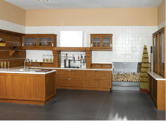 有橡木、櫻桃木、杉木等材質(zhì),其中橡木易上色,色彩更多。實木門板具有強烈的自然表達力。但國內(nèi)實木櫥柜廠家工藝水平與國際尚有較大距離,而進口實木櫥柜價格昂貴,且外形變化較少,比較適合偏愛純木質(zhì)地的中年消費者在高檔裝修中使用。由于其木材的本性,使用起來也比人造石等要相對細心。
