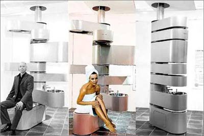 這個(gè)集成式衛(wèi)浴被形象地稱作為“脊椎”,它將馬桶、水槽、浴缸和兩個(gè)淋浴器整合在一起,形成了一個(gè)8英尺(約2.4米)高的柱體。除了分別為大人和兒童準(zhǔn)備的兩個(gè)淋浴器只能旋轉(zhuǎn)180度以外,其余部分均可以旋轉(zhuǎn)360度。整個(gè)裝置的中軸是一根鐵柱,里面囊括了所有的管道系統(tǒng)。當(dāng)你需要使用哪個(gè)部分的時(shí)候,只需將它輕輕推出來即可,非常適合小戶型。