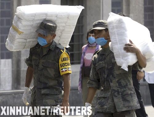 4月25日,在墨西哥首都墨西哥城,兩名士兵搬運(yùn)待分發(fā)給行人的口罩行走在大街上。墨西哥衛(wèi)生部官員何塞·科爾多瓦當(dāng)日通報(bào)說,截至24日晚間,墨西哥共有20人直接因感染豬流感病毒死亡,全國(guó)疑似病例達(dá)4000余人。 新華社/路透