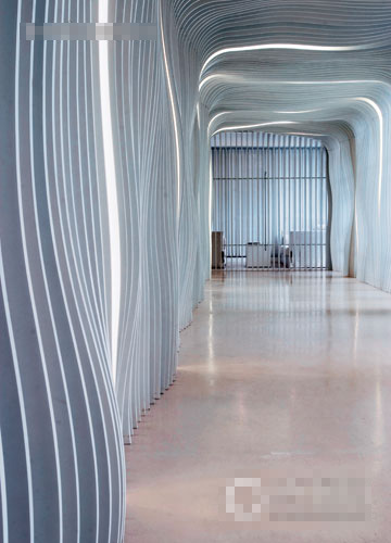 環(huán)碧堂畫廊設(shè)置著復(fù)雜的多功能空間區(qū)域,為了將訪客路線分離出來,仲松特別為其設(shè)計(jì)了一條通道,叫做“空間的雕塑”——這個(gè)長(zhǎng)17米的通道連接各個(gè)空間。通道中流動(dòng)的曲線條和室內(nèi)其他界面的直線形成了強(qiáng)烈的對(duì)比,其形象由相似曲線單元排列組成,使空間既有間隔性,又有延續(xù)性,在視覺上達(dá)到步移景易的效果,使人聯(lián)想到中國(guó)傳統(tǒng)建筑中“游廊”所特有的意境。