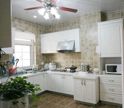 廚房采用白色的櫥柜,以及淺褐色的瓷磚,沒有其他雜亂的裝飾,整體上很整潔。
