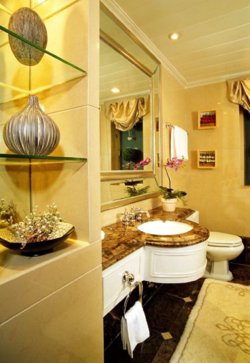 豪華衛(wèi)生間裝修:用金屬色點(diǎn)綴衛(wèi)生間,大理石臺(tái)面,玻璃裝飾架,處處顯示主人高品質(zhì)的生活最求。