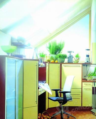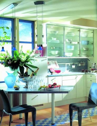 我們往往羨慕國外家庭寬大的餐廳,其實(shí)他們只是在宴請賓客時(shí)才使用如此氣派的餐廳,日常就餐都是在廚房這個(gè)空間解決的。生活在廚房,很大程度上就是指在廚房里享受美食。巧妙利用空間,讓櫥柜一物多用,營造出溫馨的就餐環(huán)境,讓居家生活的貼心快樂從清早開始就伴隨全家人。